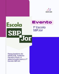 Pesquisadora do GENAJOR, Yaskara Ferreira Pinto, é selecionada para a 1ª Escola SBPJor Yaskara Ferreira Pinto, doutoranda do PPGJOR e integrante do GENAJOR, participou da 1ª Escola SBPJor, iniciativa promovida pela Associação Brasileira de Pesquisadores em Jornalismo (SBPJor), entre os dias 1 a 4 de julho. Yaskara Ferreira Pinto, doutoranda do PPGJOR e integrante do GENAJOR, participou da 1ª Escola SBPJor, iniciativa promovida pela Associação Brasileira de Pesquisadores em Jornalismo (SBPJor), entre os dias 1 a 4 de julho.O evento, que aconteceu de forma online, teve como objetivo aprimorar competências acadêmicas de quem pesquisa jornalismo no Brasil, englobando graduandos e pós-doutores. Com foco na qualificação, alguns dos tópicos abordados focaram na construção de projetos de pesquisa, justificativa e metodologia, revisão bibliográfica, escrita científica, publicação qualificada, internacionalização, editais e responsabilidade social da pesquisa. Acesse mais detalhes no site do PPGJOR.