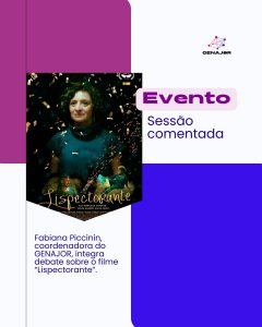 Fabiana Piccinin, coordenadora do GENAJOR, integra debate sobre o filme “Lispectorante” No dia 30 de maio, a Profª Drª Fabiana Piccinin, do GENAJOR, participou da sessão comentada do filme “Lispectorante”. Integrando a programação do Cineclube Catarina Fantástica, no Cinema Gilberto Gerlach, no Centro Integrado de Cultura (CIC), em Florianópolis, o evento contou com entrada gratuita e reuniu interessados/as na intersecção entre cinema, literatura e jornalismo. No dia 30 de maio, a Profª Drª Fabiana Piccinin, do GENAJOR, participou da sessão comentada do filme “Lispectorante”. Integrando a programação do Cineclube Catarina Fantástica, no Cinema Gilberto Gerlach, no Centro Integrado de Cultura (CIC), em Florianópolis, o evento contou com entrada gratuita e reuniu interessados/as na intersecção entre cinema, literatura e jornalismo.Dirigido por Renata Pinheiro, o filme entra no universo lírico de Clarice Lispector (1920-1977) e narra a história de Glória Hartman (Marcélia Cartaxo), artista plástica em crise existencial que retorna a Recife e descobre um portal para um universo fantástico nas ruínas da antiga casa da escritora. Fabiana integrou o debate sobre o filme ao lado da escritora e jornalista Luciana Tiscoski e do crítico de arte Allende Renck, promovendo uma discussão interdisciplinar. Com informações do PPGJOR.